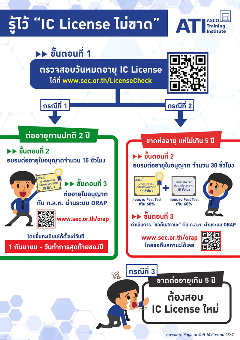 ท่านต้องยื่นต่ออายุในอนุญาตกับสำนักงาน ก.ล.ต. โดยยื่นคำขอต่ออายุผ่านระบบอิเล็กทรอนิกส์ online (ระบบ ORAP) ที่ https://www.sec.or.th/orap ระหว่างวันที่ 1 ก.ย. – วันทำการสุดท้ายของปีที่หมดอายุ (ข้อมูล ณ วันที่ 10 ธันวาคม 2567)
